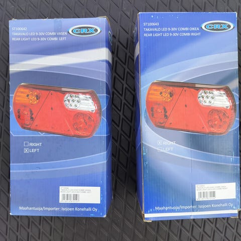 12/24V LED takavalot, hyväksytyt. Ei olleet paikallaan, mutta kokeiltu ja todettu toisessa parkin palavan yhtä kirkkaana, kuin jarruvalon. Takuuvaihto jäänyt tekemättä. Näppärä pistää vastuksen väliin tms. Lisäksi käytetyt tappivalot, etanansarvivalot perävaunun taakse ja lyhyet tappivalot, jotka ovat uudet. Nämä äärivalot ovat halogenvaloja, eli käyvät vaikka museovehkeisiin. Ja saahan niihinkin ledpolttimot halutessaan..