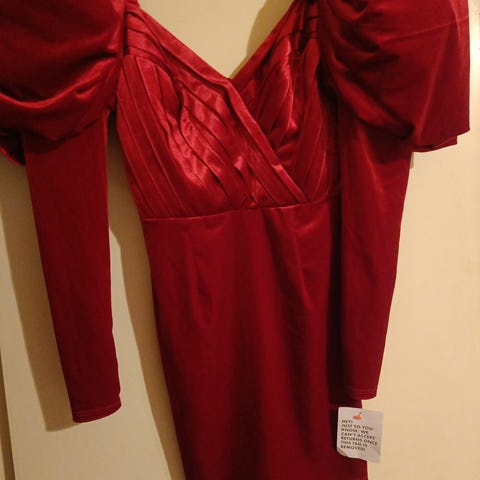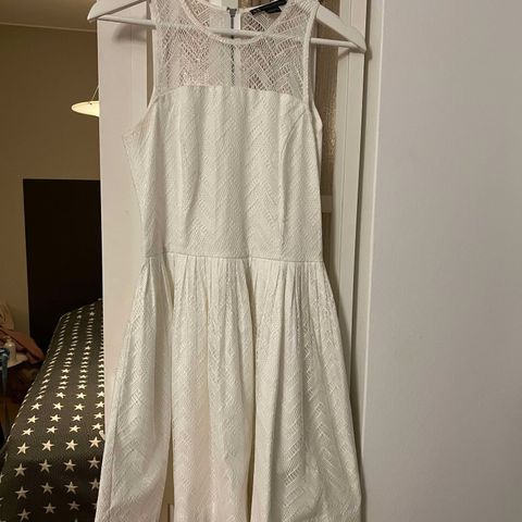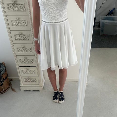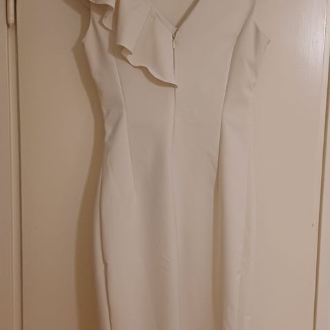 Valkoinen vartaloa myötäilevä mutta joustava juhlamekko. Näyttävä selkä jossa kultaisista helmistä tehty koriste. Puolipitkät hihat. Mekon kokonaispituus noin 73cm, kaikai noin 34cm mutta venytettynä noin 5cm lisää. Ei postitusta ja maksu vain käteisellä.