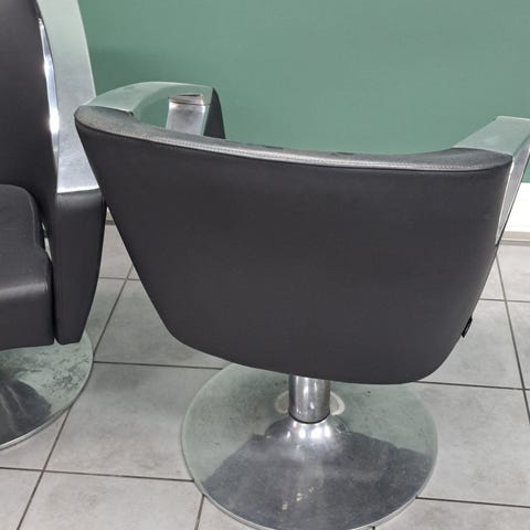 Kampaamotuolit/Design merkki, 1 lähes täydellinen, 3:ssa reikiä ja yhdestä puuttuu alapumppu. Itse olen peittänyt repeämät koristetaljoilla.