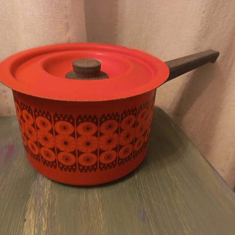 Finelin punainen Kehrä-emalikattila. Halkaisija 17,3 cm ja korkeus 11,5 cm. Tilavuus n. 2 litraa. Käytetty kunto. Kuvion design Raija Uosikkinen 1960-luvulla.