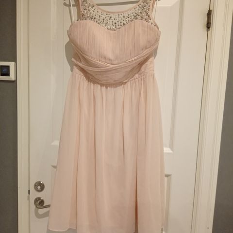 Kaunis juhlamekko, jonka yläosassa kukkakuvioita. Mekon takana on vetoketju, minkä lisäksi mekosta löytyy lenkit vyölle. Vyönä voi käyttää mukana tulevaa nauhaa tai omaa vyötä. Mukana myös säädettävät olkaimet.