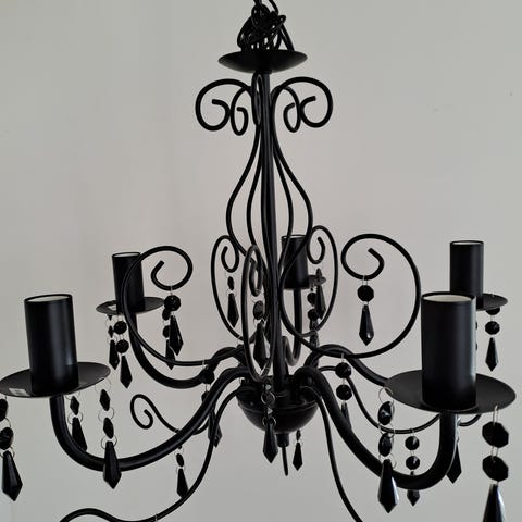 Myynnissä muovinen kattokruunu, 6 lampettia.