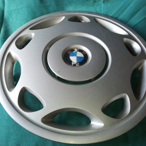 Kuvan alkuperäinen käytetty BMW:n pölykapseli (1 kpl). Kaikki kiinnikkeet kunnossa. Tuotteessa on hiukan reunan naarmuuntumista ja vaihdettavissa olevan keskiömerkin/-tarran kulumista (katso kuvista). Ilmeisesti mallista 3-sarja E36. Halkaisija n. 41,5 cm.