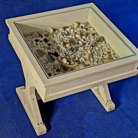 Pöydän leveys 140 cm, syvyys 90 cm ja korkeus 40 cm.