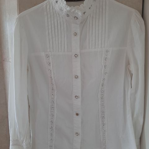 Hihoissa ja edustassa kauniit pitsikuviot, kaula-aukossa viisi nappia.