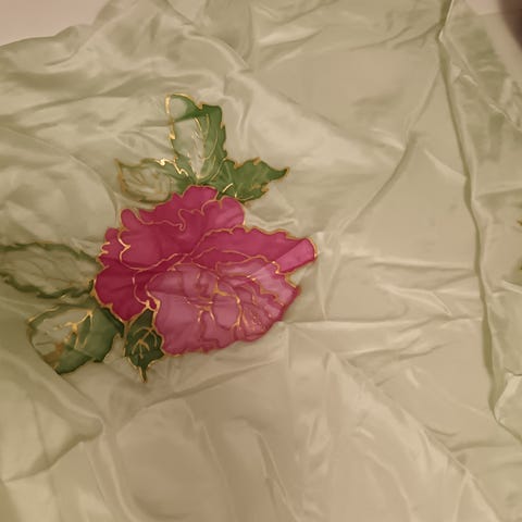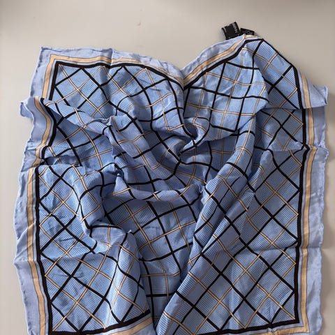 Silkkihuivi, käyttämätön. Pieni, kevyt. Pituus n. 68 cm pidemmällä sivulla. Leveys n. 13 cm.