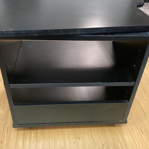 Tumma tv taso renkailla. Päällinen osa on liikuteltava (ei tarvitse liikuttaa telkkaria jos haluaa kääntää eri suuntaan). Sisältää 2 hyllyä ja lasiovet (mitkä saa lukkoon).