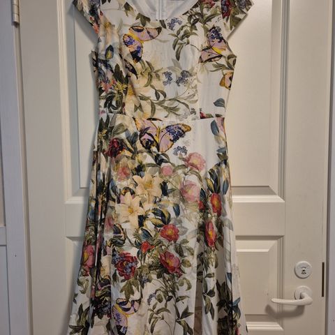 Kaunis liehuva kesämekko. Hihat pyffimaiset. Alumekko mekossa mukana. Vastaa kokoaan mutta maahtuu 38 kokoiselle myös. Mekko peittää polvet