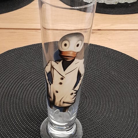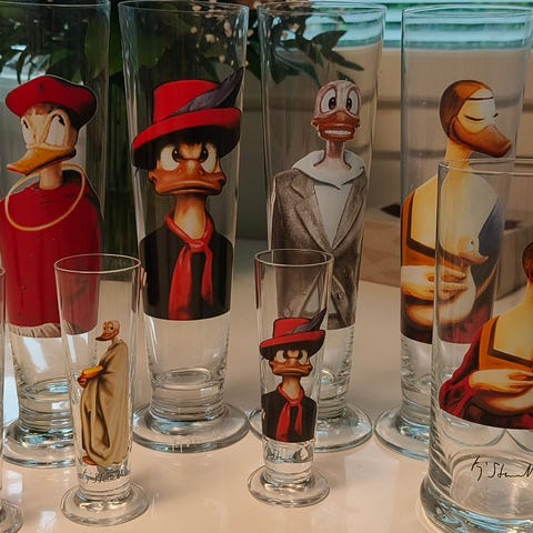 Neljä Kaj Stenvallin ankka olutlasia, korkeus n 22,5cm. Lasit ovat olleet koristekäytössä. Lasissa, missä ankka harmaassa takissa, on pohjassa sormella tuntuva pieni särö. Täysin ehjien lasien hinta on 12 euroa kappale. Lasin säröllä hinta on neuvoteltavissa.