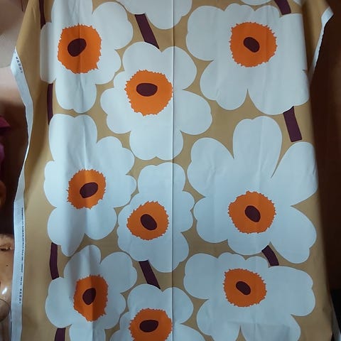 Myydään 4 metriä Marimekko Unikko kangasta tummansinisen sävyinen unikko. Toinen reuna ei ole suora, mutta kangasta hiukan yli 4 metriä eli saa suoristettua reunan. Taustaväri luonnon valkoinen.