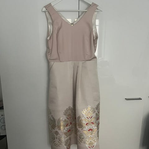 Ted Bakerin keltainen puuvillamekko kauniilla vyötärökaistaleella. Sivusaumassa piilovetoketju ja taskut.