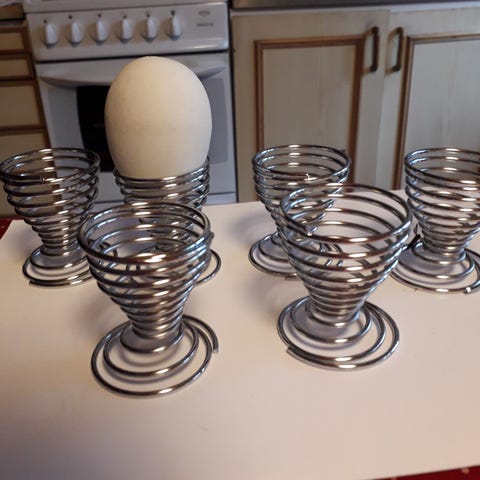 Kaksi valkoista vanhaa jalallista muovista munakuppia. Korkeus 5,8 cm.