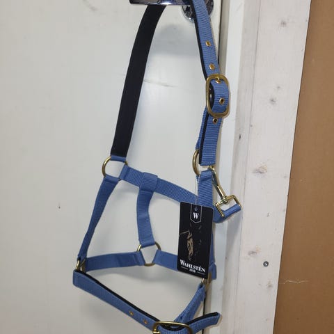Velj Wahlstenin riimunvarressa (musta nahka ja kullanvärinen metalli) on vielä laput kiinni. Riimua on käytetty päässä parina päivänä talliin viennin ajan. Koko FULL.