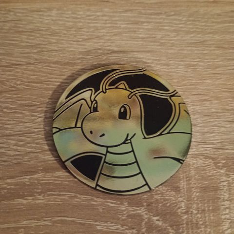 Vanha Aerodactyl Pokémon pelikorttien mukana tullut kolikko. Halkaisija 3 cm. Siisti kunto, pientä hiusnaarmua pinnassa.