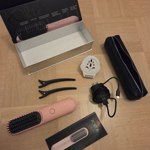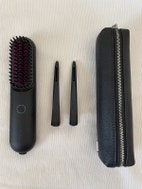 Tymon kätevä pieni langaton kuumaharja / suoristusharja / lämpöharja. Mukaan klipsit ja pussukka. Kulkee hyvin käsilaukussa. Voi käyttää sekä langattomasti että johdon kanssa. Lämpö säädettävä kolmeen eri asteeseen.