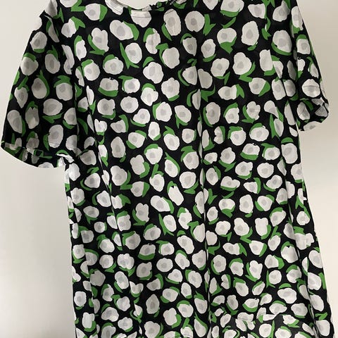 Kuvan mukainen. Puuvillapopliinia. Takana lyhyt vetoketju. Kainalo 54 cm, pituus 70 cm