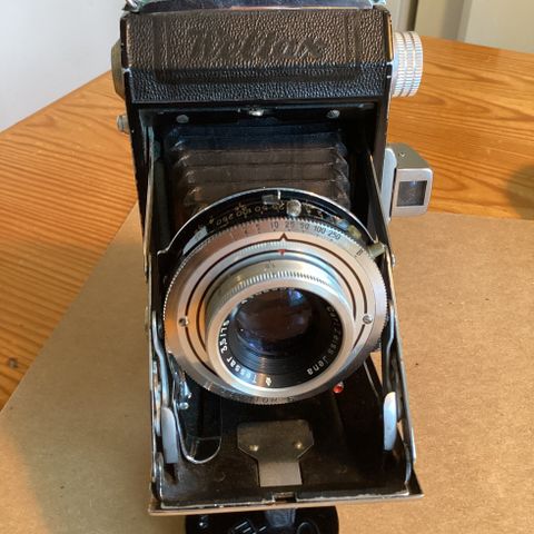 Myydään saksalaisen Zeiss Ikon -yhtiön vuonna 1955 tai 1956 valmistama Super Ikonta IV 120 rullafilmikamera Tessar 75mm f3.5 -objektiivilla. Kamera käyttää tavallista 120 filmiä ja se ottaa 6x6 cm kokoisia kuvia.