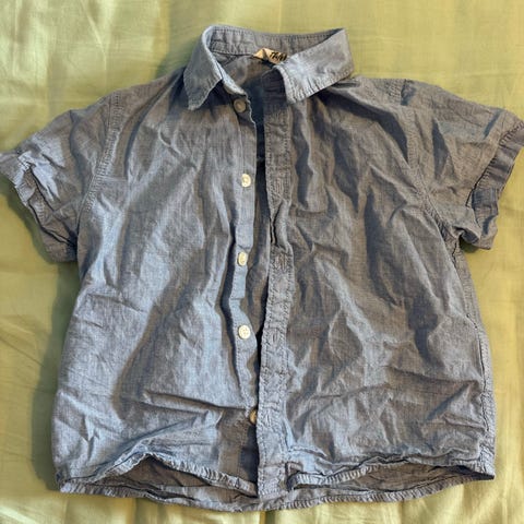 Poikien siniharmaa Lassi kauluspaita, koko 104cm. Mustat napit. Hihan sisämitta noin 27cm.