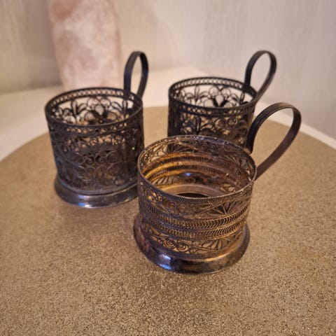 koristeellinen teräksinen teesetti yksityiskohdilla, settiin sopiva tarjoitin mukaan! (Nouto Rastilasta)