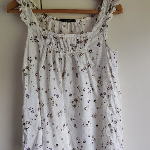 Valkoinen hyväkuntoinen yli olkapään pusero. Yksi pieni keltainen aika näkymätön tahra löytyi.. Edessä kuminauha.