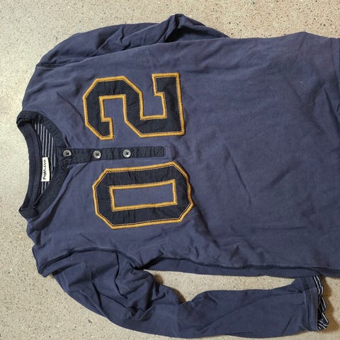 POMPdeLUX sinivalkoraidallinen löysä puuvilla t-paita kokoa 140. Edessä nappi yksityiskohdat. Löysä helma.