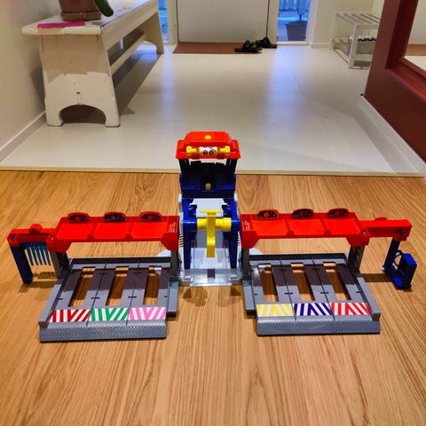 Ryhmä Hau Rekkapysäkki Päämaja.Avautuu yli 91,4 cm keveäksi.Valvomon voi nostaa ylöspäin.Tuunausasemalla voi tankata ja autonopesupaikka toisessa reunassa.Valvomossa napista painamalla tulee ääni (2X3A paristot,kuuluu hintaan). Hahmot ja autot ei kuulu mukaan.Osat voi irrottaa toisistaan.Tästä tosi edullisesti kiva lahjaidea .Nouto.