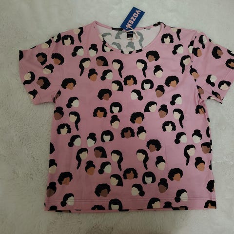 Ze-Ze Nordicin huoleton t-paita kauniissa kukkakuosissa. Pohja musta, kukissa eri keltaisen sävyjä. Helppohoitoista viskoositrikoota, jota ei tarvi silittää. Suora malli, jossa pussihelma eli helmassa on resorin tyyppinen kapea kaistale samaa kangasta. Pyöreä pääntie. Lyhyet holkkihihat, joiden suussa kapeat kaistaleet samasta kankaasta. Laskeutuu hyvin. Materiaali: Joustava viskoositrikoo 92% viskoosia ja 8% elastaania. Kerran päällä ollut. Myyn koska väri ei sovi minulle. Pesty pesuohjeiden mukaan.