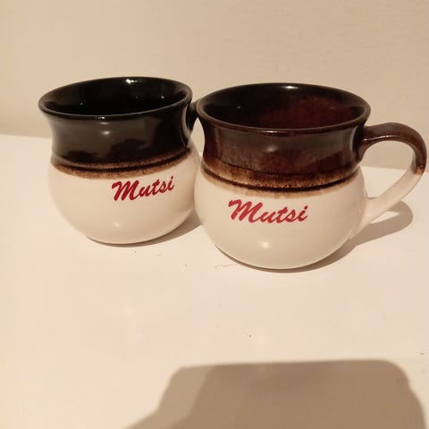 Myydään isot lattemukit tms. sekä näihin kuuluvat lautaset. Mukin vetoisuus 4 dl. Lapin savi.