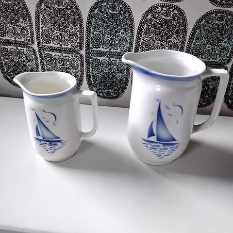 Vanha sininen muki Purjelaiva kuvalla. Kuva on molemmin puolin mukia. Mukin korkeus 7,5 cm. Hinnasta en tingi, koska muki on erittäin hyvässä kunnossa, ei kolhuja tai naarmuja. Nouto Klaukkalasta, maksu käteisellä.