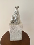 Tämä keraaminen taideteos kooltaan 11 x 11 cm, h jäävuori 17 cm + jääkarhu 14 cm, kuvastaa ilmaston muutosta ja sen surullista loppua viimeisellä jäälohkareella.