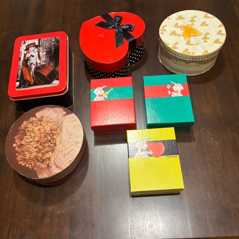 Musta valko kuvioiset peltirasiat kolmea eri kokoa