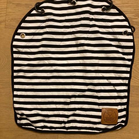 Baby Wallaby -merkkinen vaunuverho. Kaksinkertaista puuvillaa. Toinen puoli raidallinen, toinen valkoinen. Valkoisella puolella hieman lähtemätöntä likaa ja verhon ylin metallirenkula irronnut, ks kuvat. Mukaan 4 harmaata muovirengasta kiinnittämiseen.
