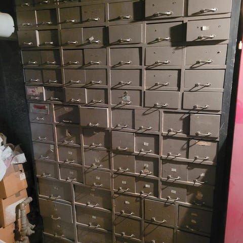 Helsingin Yliopistosta peräisin oleva vanha arkistolokerikko. Mitat 125x103x50. Neljä lokeroa puuttuu.