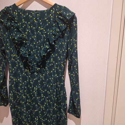 Uhanan upea pitkähihainen maximekko kauniilla kuosilla. Mekon edessä ja takana on röyhelöt ja helmassa on pitkä halkio. Pyöreä pääntie ja sivussa piilovetoketju.