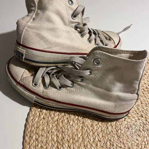Hyvässä kunnossa olevat valkoiset Converset. Valkoinen kangas on sivuista ja takaa hieman tummentunut.