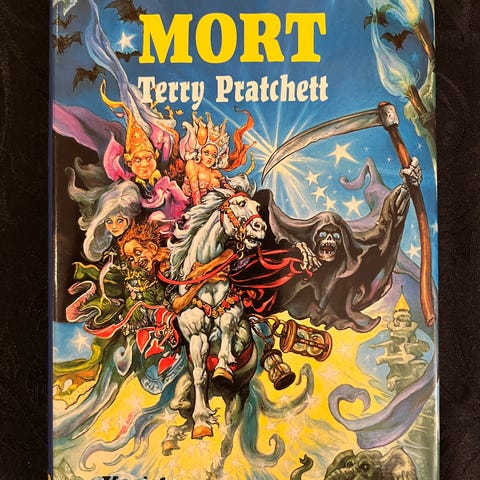 Englanninkielinen Terry Pratchett: Mort kovakantisena. Kirjassa on kirjanmerkki nauha. Kansien reunoissa on kulumaa ja näistä kuvat. Muilta osin kirja on hyväkuntoinen, ei repeymiä tai tahroja yms.
