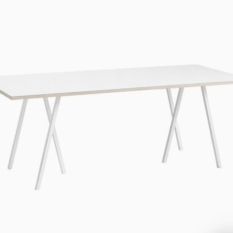 Tanskalaisen Hayn Loop Stand pöytä valkoisella pöytälevyllä ja mustilla jaloilla. Pöytä kuuluu Leif Jørgensenin suunnittelemaan huonekalumallistoon.