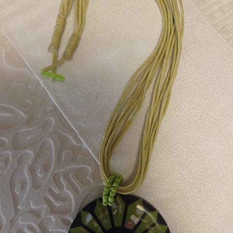 Kaulakoru pikkuhelmistä verkkopujottelulla. Ympärys n. 40cm, kaksinkerroin käy myös rannekoruksi. Lev. n.1.7cm, nepparikiinnitys.