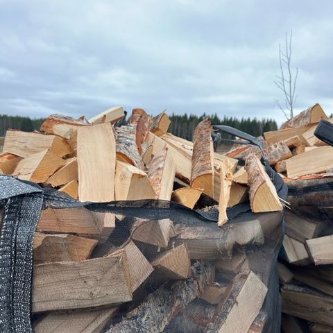 Tänä vuonna tehtyä koivuklapia n.33cm kuution säkeissä reilusti täytettynä. Voidaan traktorilla nostaa kyytiin.kuivaa