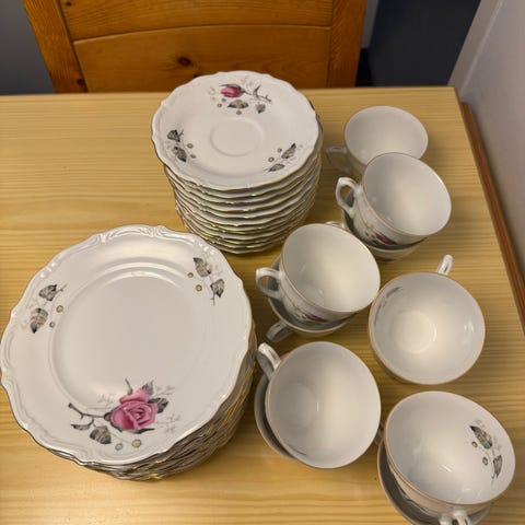 Puolalainen Wloclawek posliiniastiasto: 36 kuppia, 25 aluslautasta ja 26 kakkulautasta kahdessa puulaatikossa. Mahdollisuus jakaa puoliksi, jolloin hinta 20 eur/ltk/12 pkl setti.