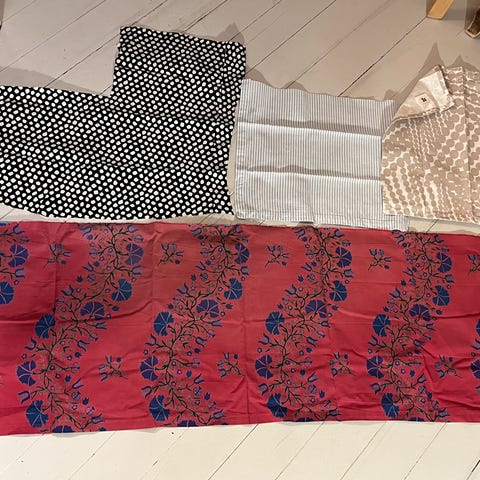 Marimekon kankaita esim. tilkkutöihin ym. Kuvissa hinnat
