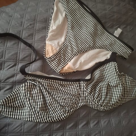Käyttämättömät, kerran pestyt laatumerkin bikinit. Mustavalkoiset pilkulliset. Yläosan koko 70 E, vastaa kokoa 75 D. Kaarituet, kupeissa vuorikangas mutta ei toppausta, etupuolella röyhelöä, klipsikiinnitys takana. Housut reiluhkoa M-kokoa.