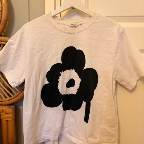 Marimekko Kapina Unikko T-paita. Koko M. Valkoinen + monivärinen Unikko kuvio. Viimeisessä kuvassa näkyy pienen pieni reikä ja ylempänä ehkä kärpäsen kakka tahra. En ole yrittänyt poistaa. Muuten kunnossa ei moitittavaa.