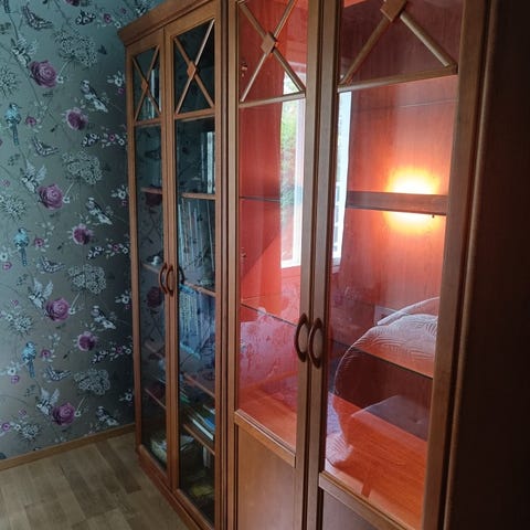 Puuseppä isäni tekemä vitriini. Hyväkuntoinen. lasihyllyt yläkaapeissa alakaapeissa levyhylly. Kuvan tavarat eivät kuulu kauppaan. Purettavissa kuljetusta varten. Saa myös tarjota rohkeasti hintaa.