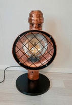 Uniikki, ilmeisesti vanhasta Idman 80182 teollisuuden valaisin mallista rakennettu upea rustiikkinen lattia/pöytävalaisin. Kuparipinta lakattu. K: 60cm, L 30cm ja S 32cm. Nouto ja kuljetus lähialueelle sovitusti.