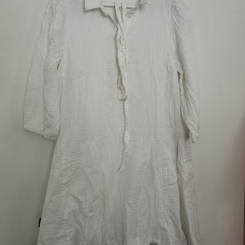 Sandwich mekko, etuosa pellavaa, muuten puuvillatrikoota. Pituus 97 cm, kainalo-kainalo 51 cm.