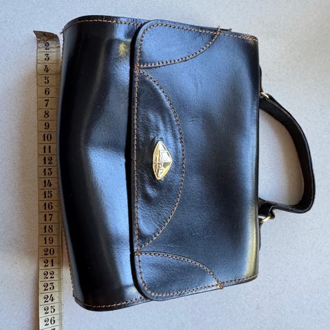 Tyylikäs ja oikein hyväkuntoinen ja napakka käsilaukku mikä mahtuu vaikka olkapäällekin. Siisti myös sisältä. Pinta on krokotiilinnahkakuvioinen. Päällä vetoketju, sisällä 2 lokeroa + keskellä vetoketjullinen tasku ja sivussa pieni vetoketjullinen tasku sekä kynille paikat. Korkeus 15,5cm, leveys 28cm, syvyys pohjasta 6cm, kantokahvojen koko pituus noin 54cm. Koiratalous