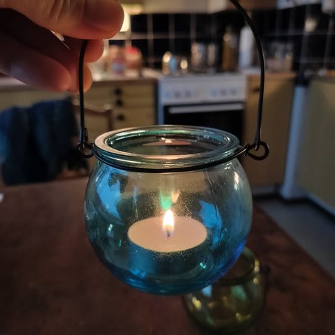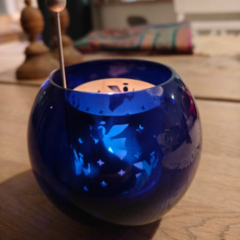 Ristomatti Ratian Muurlan lasille suunnittelema enkeliaiheinen tuikkulyhty, joka on lasia ja jossa on sininen metallinen kehikko.
