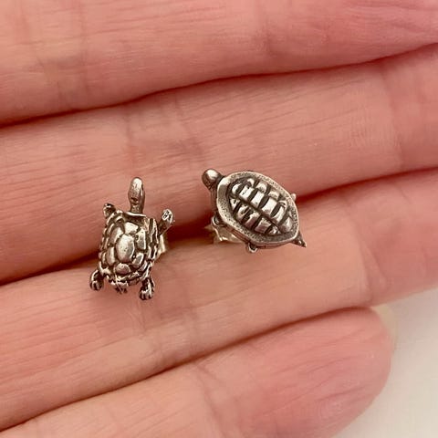 Kilpikonna-korvakorut kivisiruilla. Korkeus renkaan kanssa 4,5 cm. Postitus kirjeenä + 3 euroa tai nouto Kalliosta. Useampi tuote tulee samoilla postikuluilla.