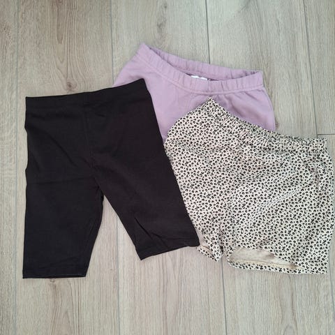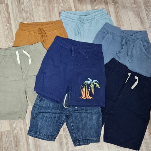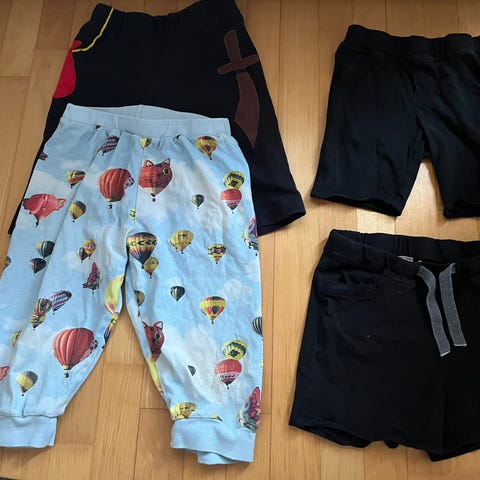 Neljät next ja yhdet name it - shortsit. Vaaleansiniset name itit kuluneimmat. Housuissa lukee, että ovat 7 -vuotiaalle / 122, mutta eivät enää oikein mahdu meidän liki seitsemänvuotiaalle (128 cm) , eli tuo 122 cm ainakin meidän tapauksessa oikeampi kokomitta. Kaikki housut joustamatonta kangasta. Pesty hajustetulla pesuaineella.